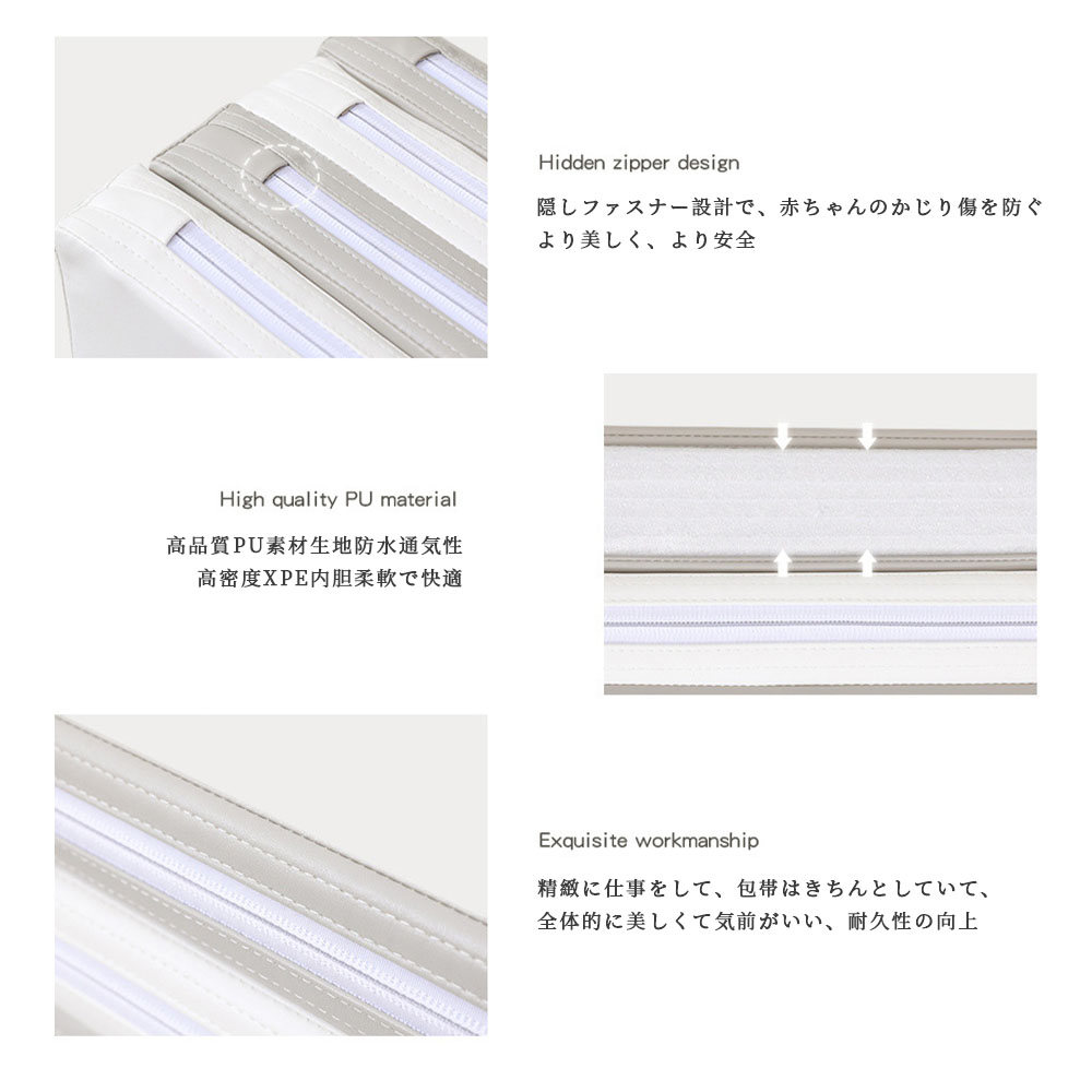 表面は柔らかな水溶性PU素材とコア(プレス)技術により作られており、生地は接着剤などの有機溶剤を使用していないので、赤ちゃんが噛んだり舐めたりしても大丈夫。また、ハイテクノロジー・コーティング技術を使用しており、色柄の褪色がしにくいのも特徴です。