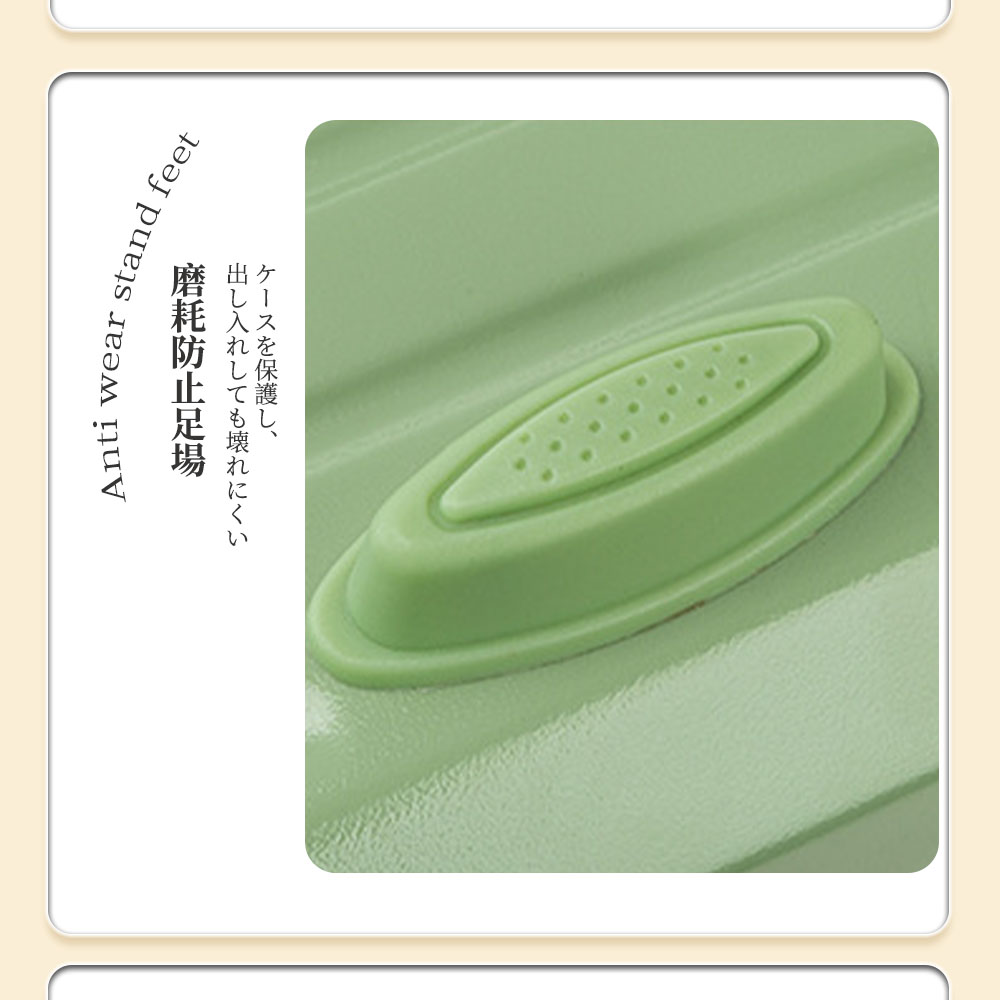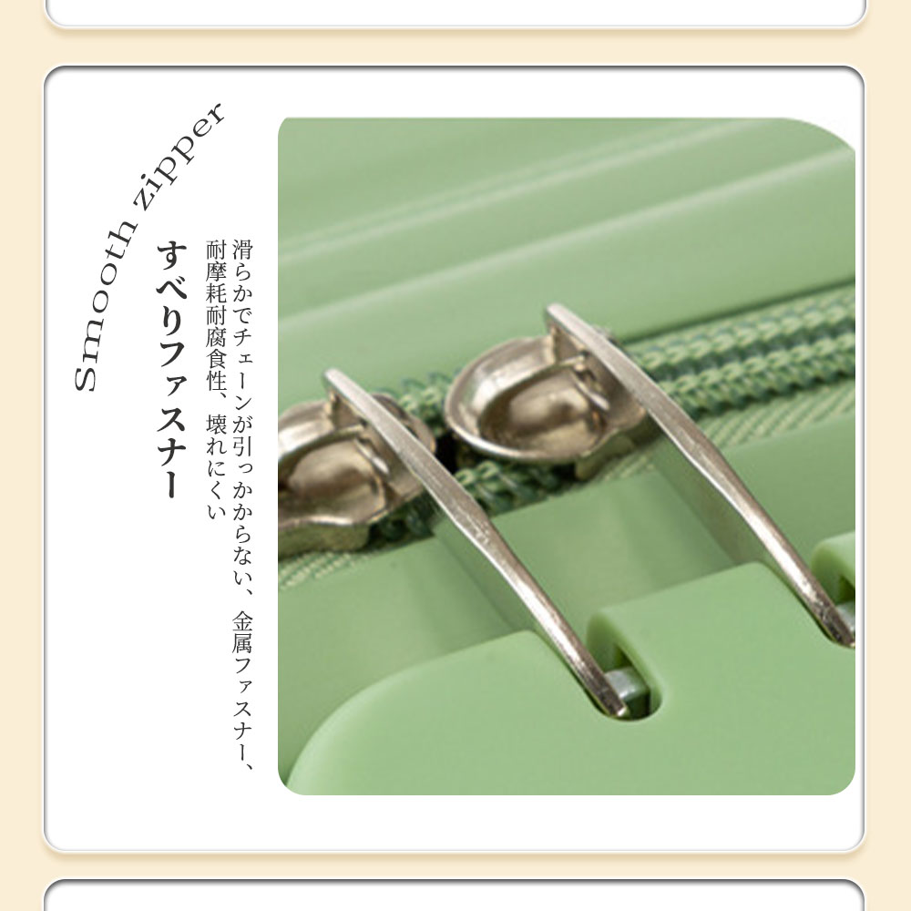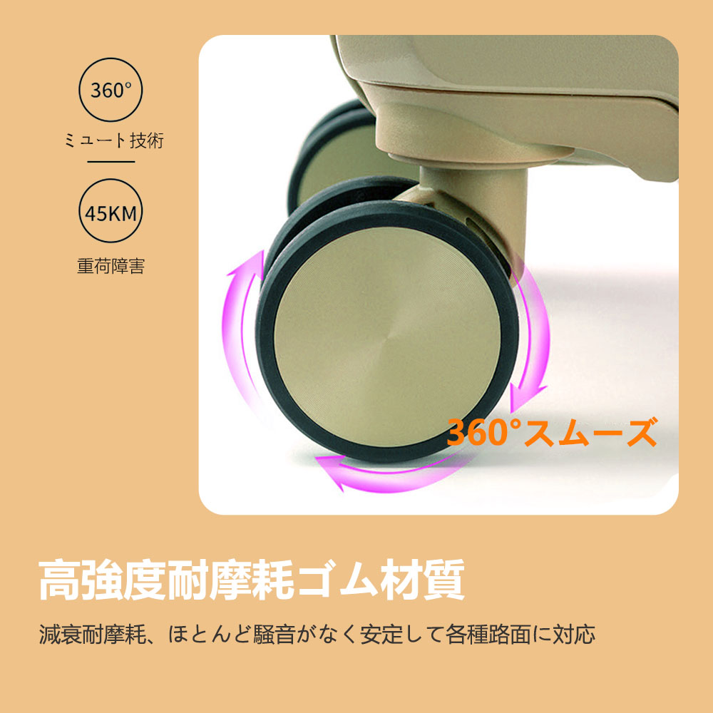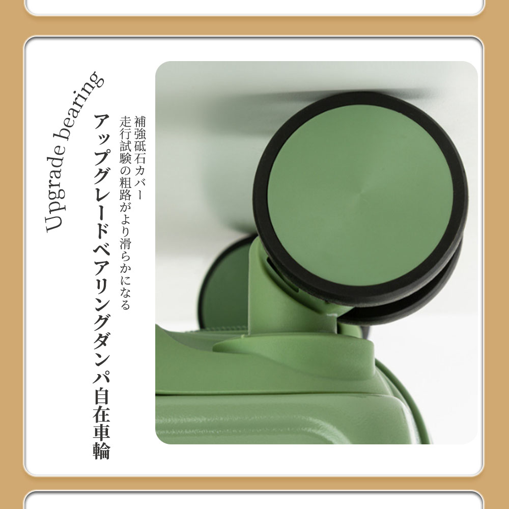 「静 音」静音ダブルキャスターが搭載されている、気兼ねなく持ち歩けるのも魅力です。360°回転に対応しているため、小回りが利き。人混みのなかや狭い道を通るときでも、自分の体にピッタリとくっ付けてスムーズに移動できるのが魅力です。